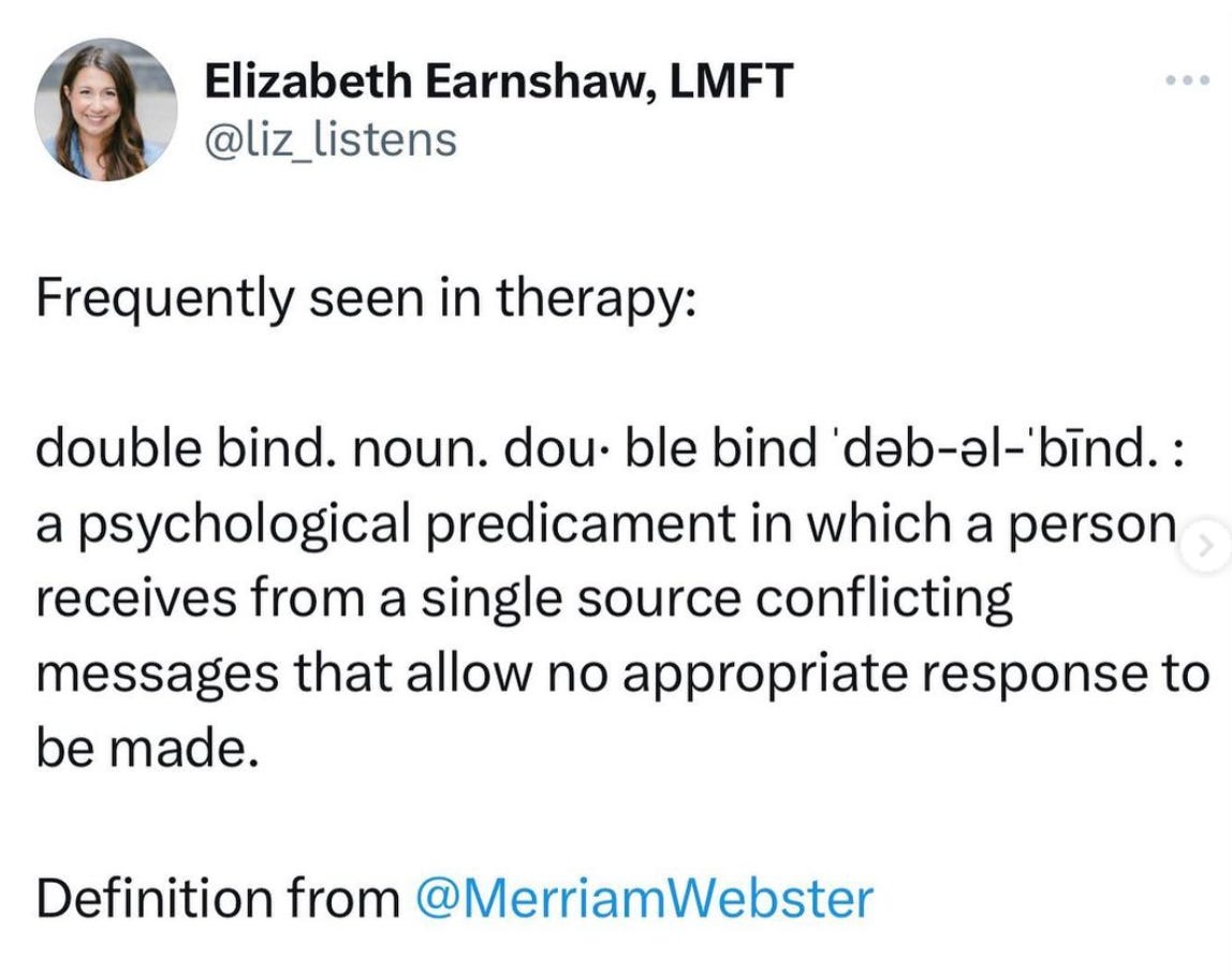 A double bind is a complicated communication pattern where one person sends two opposing messages. The receiver of the message is unsure of which message to go with, however it won’t matter. There is no “winning” response.